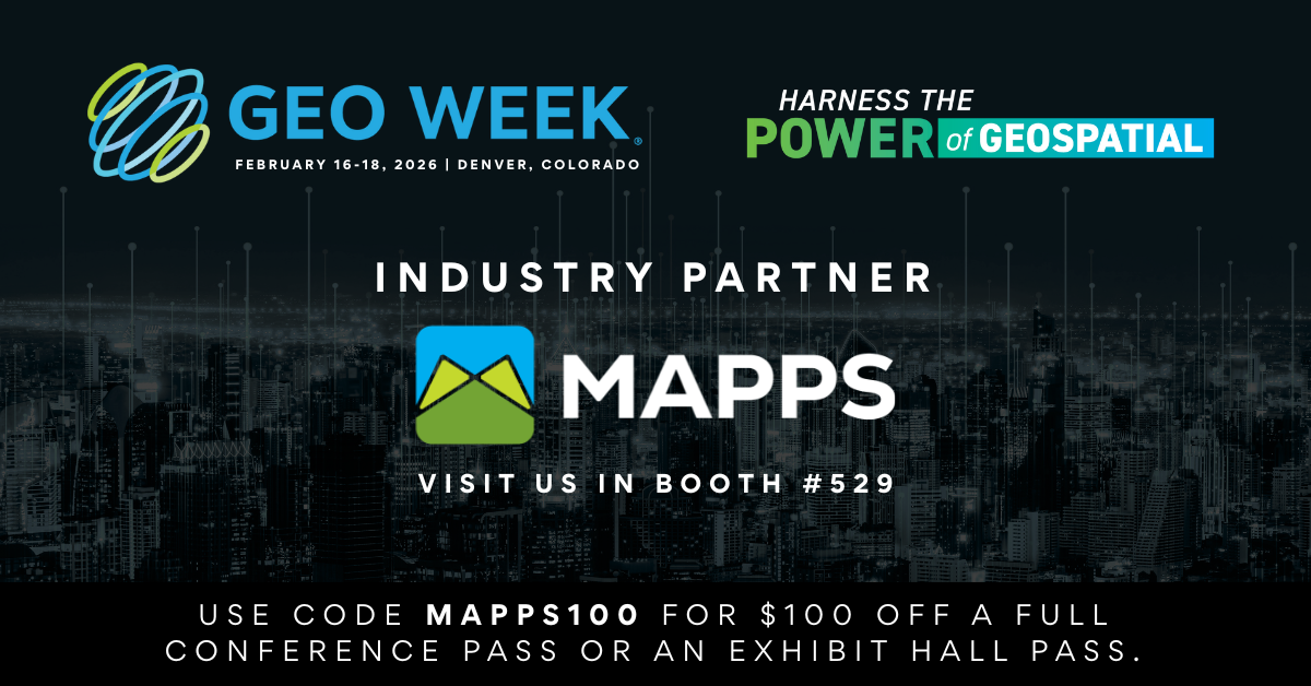 Geo Week’s conference program and tradeshow floor provide expert insights, real-world case studies, cutting edge tools, and unmatched peer-to-peer-networking. MAPPS is a proud Industry Partner of Geo Week and will be exhibiting at booth 529. All MAPPS members receive $100 off to attend the Geo Week Conference Program, use code MAPPS100 when registering. For more information, visit https://www.geo-week.com/. Learn more about the partnership at https://www.geo-week.com/mapps/.